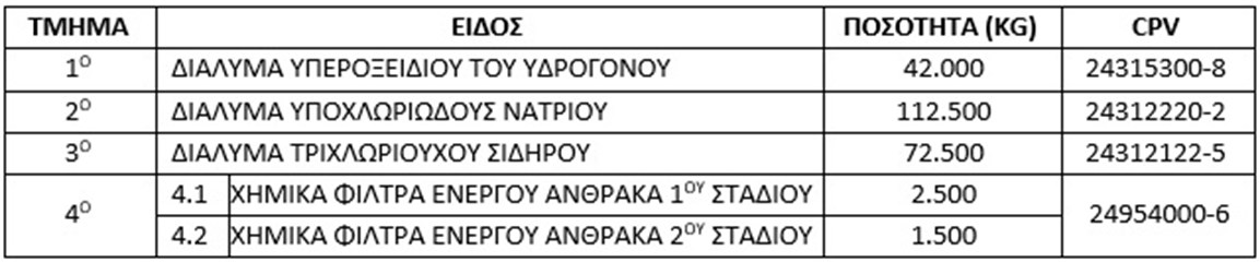 ΑΝΤΙΚΕΙΜΕΝΟ: Η Προμήθεια Χημικών Υλικών, για: α) την Εγκατάσταση Επεξεργασίας Λυμάτων (ΕΕΛ) β) τις εγκαταστάσεις Ύδρευσης και γ) τις εγκαταστάσεις Αποχέτευσης, της Δ.Ε. Πλατανιά.